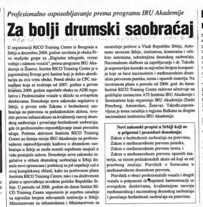 Dnevni ekonomski list „Privredni pregled“ u broju iz 2009. godine, objavio je članak pod naslovom „Za bolji drumski saobraćaj.“ Naime, Rico Training Centre realizovao je u decembru 2008. godine prvu studijsku grupu po programu: Digitalni tahograf, vreme vožnje i odmora vozača.